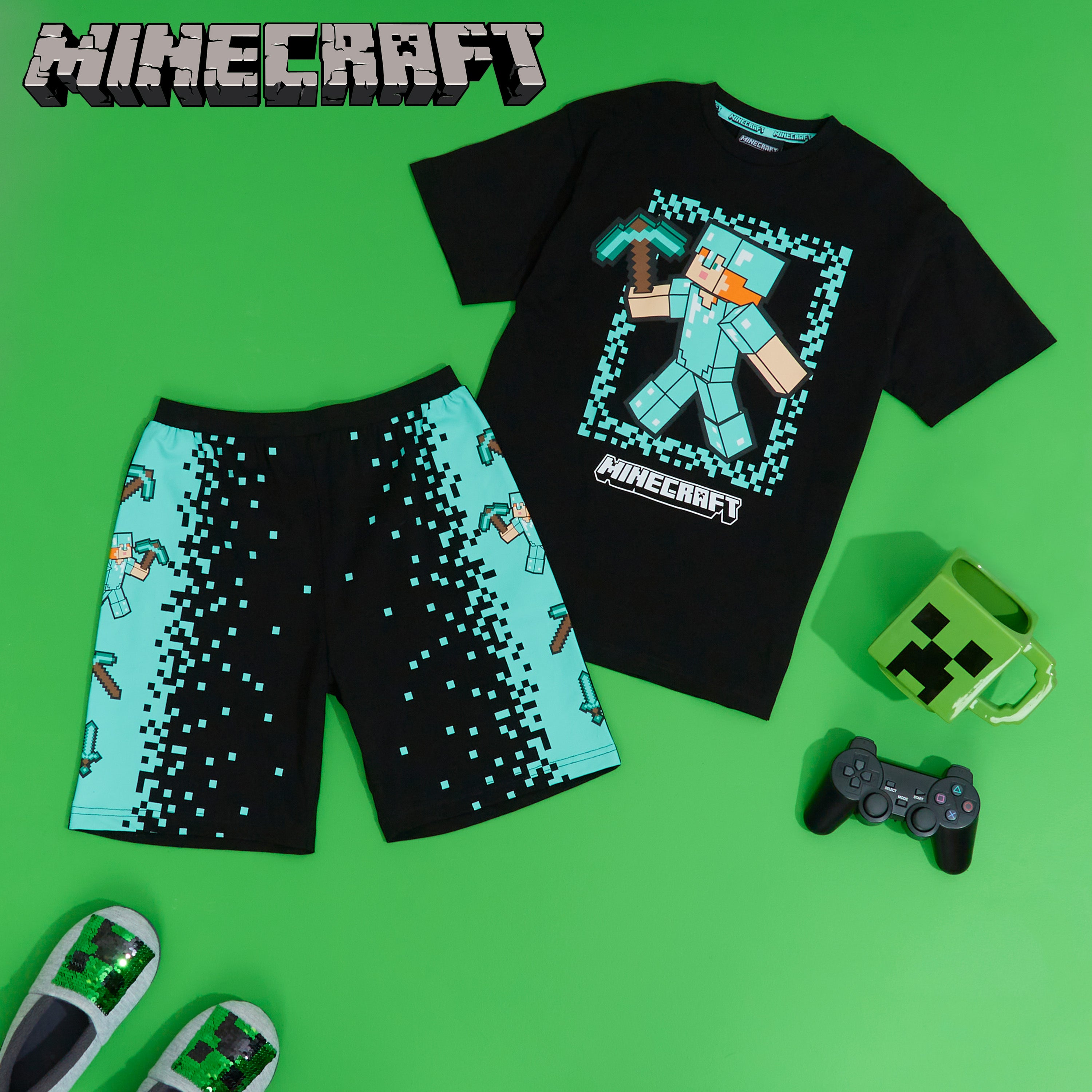 Minecraft Boys Short Pyjamas Set, Comfy Cotton Lounge Wear - Black/Green